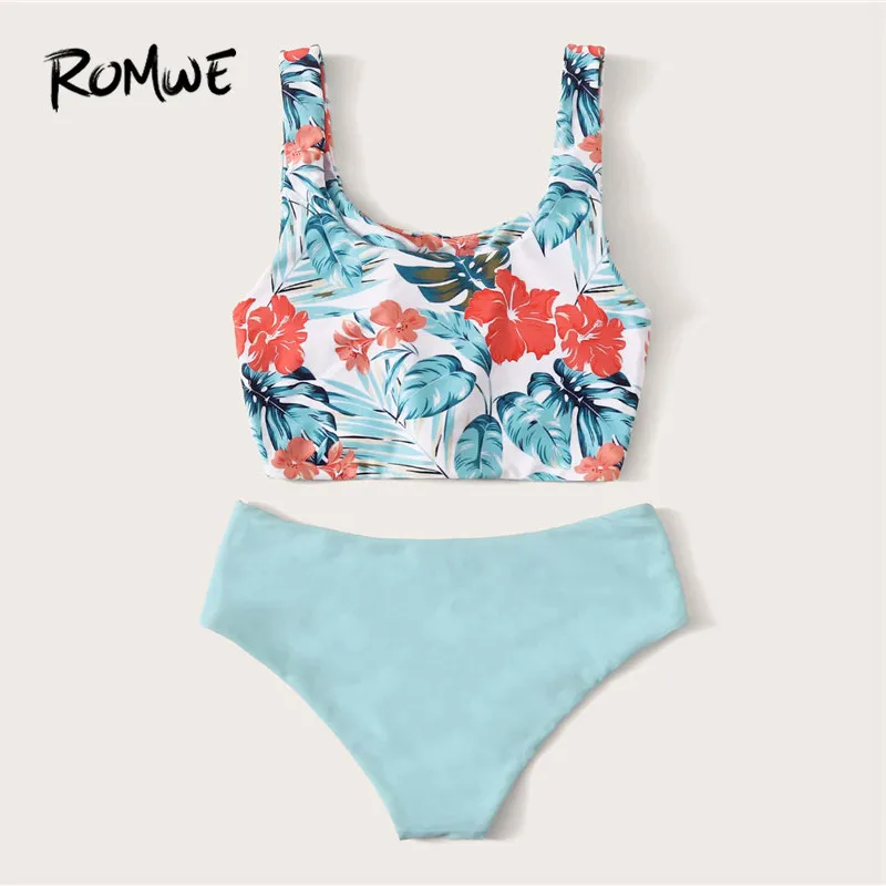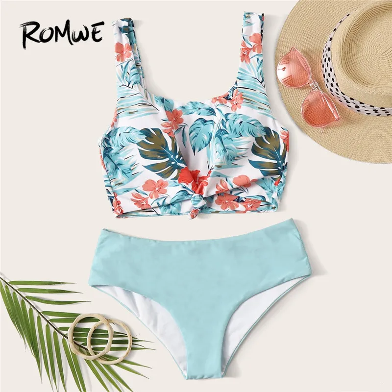Best Price Comparison With Romwe Sporty Floral Print Bikini Set Boho Beach Blue Scoop Neck Swimwear Women Wireless Knot Front Bathing Suit Cute Swimsuit