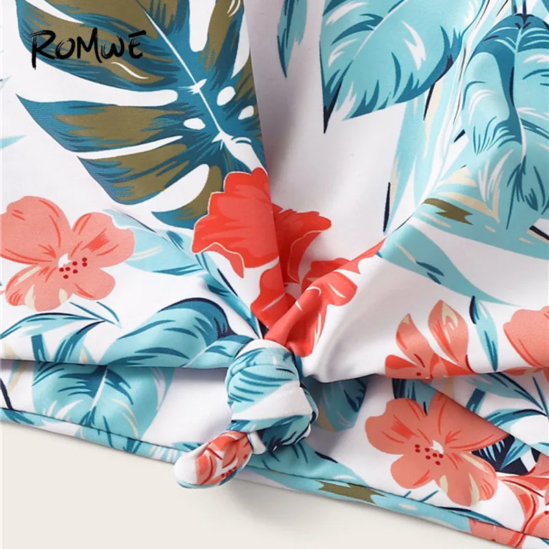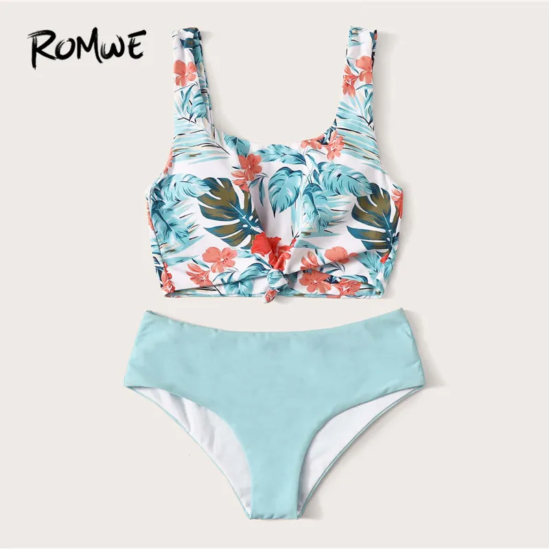 Romwe Sporty Floral Print Bikini Set Boho Beach Blue Scoop Neck Swimwear Women Wireless Knot Front Bathing Suit Cute Swimsuit