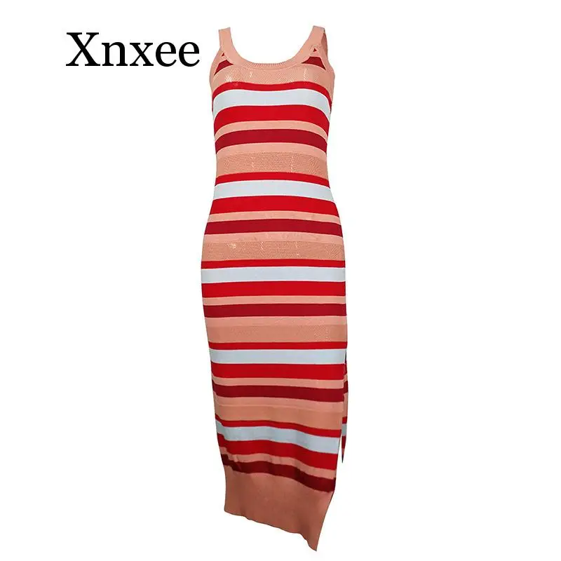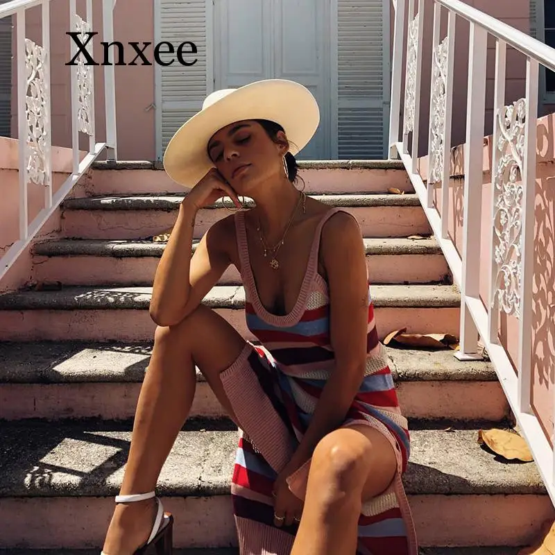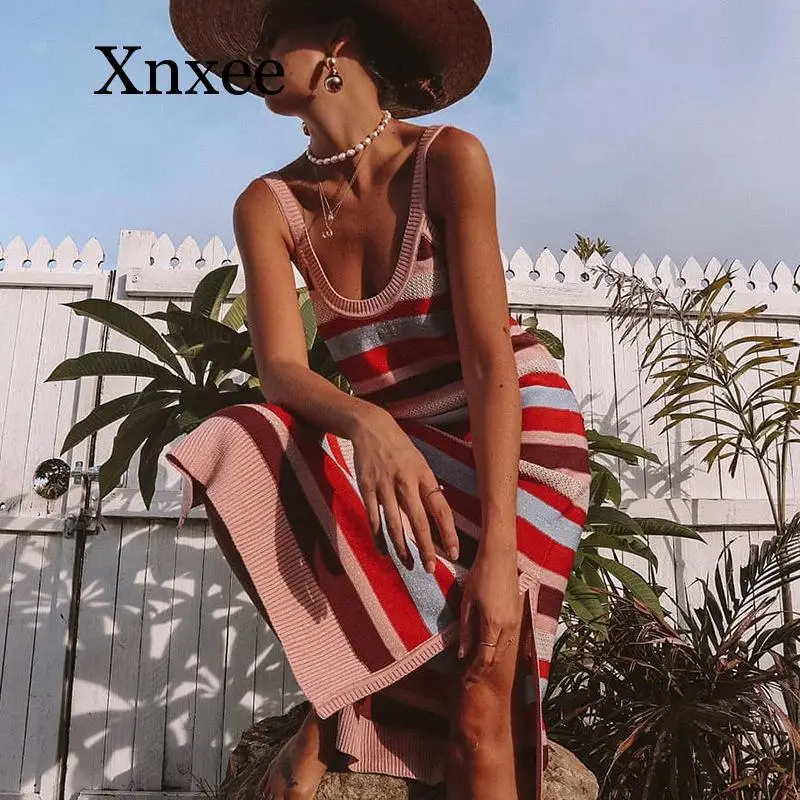 2020 New Low Cut Women Dress Beach Cover-ups Crochet Knitted Tunic Bikini Cover up Swim Striped Beachwear Split Long Kaftan
