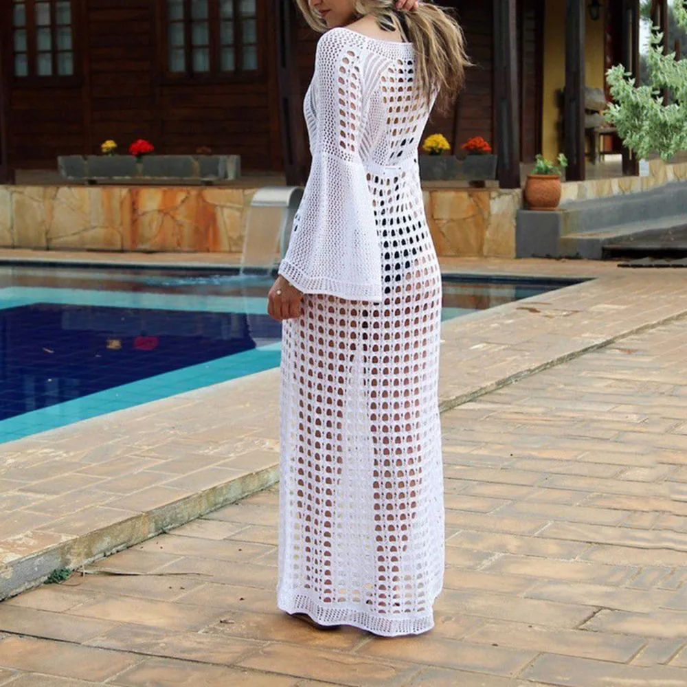 Sexy Hollow Transparent Beach Tops Women Elegant White Long Dress Summer 2020 Beachwear Black Sundress Split Knitted Dresses