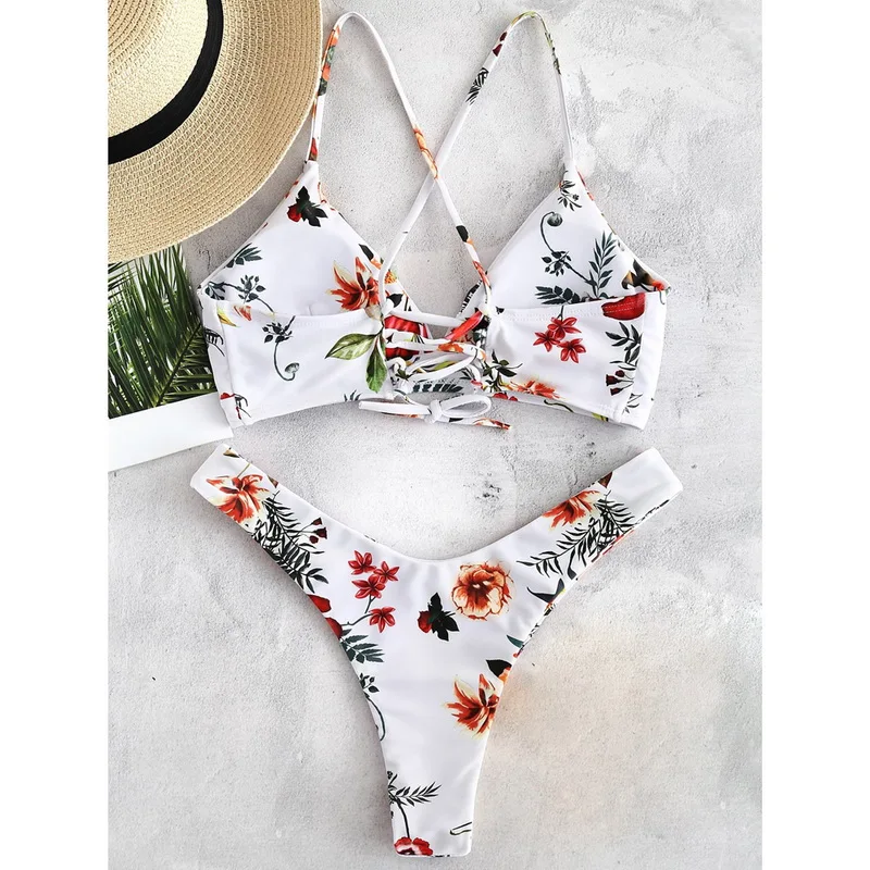 2020 Women Sexy Bikini Set Lace Up Floral Bandage Swimsuit High Waist Thong Brazilian Biquini swimwear Summer Beachwear