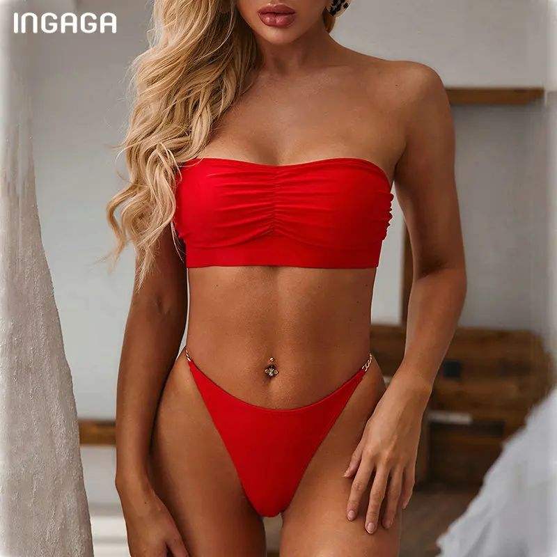 INGAGA High Waist Bikini 2020 Sexy Bandeau Swimwear Women Solid High Cut Biquini New Ruched Swimsuit Feamle New Strap Bathers